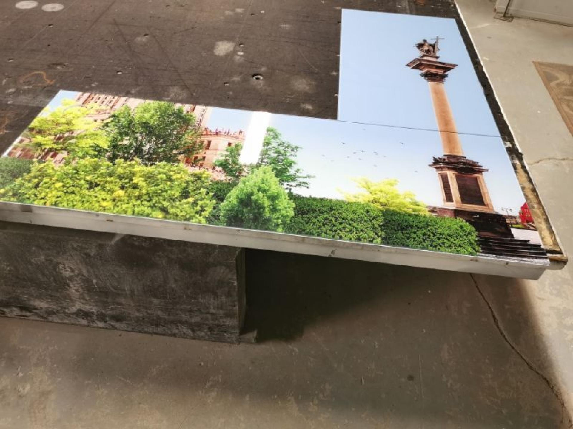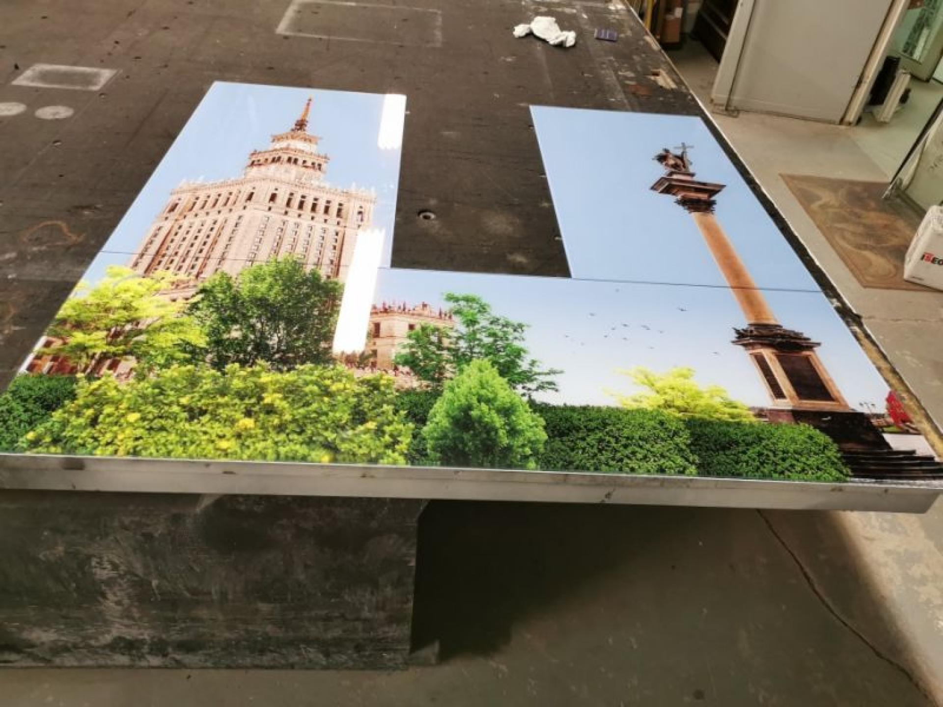 Un décor photo numérique représentant la ville de Varsovie à été collé sur la crédence .