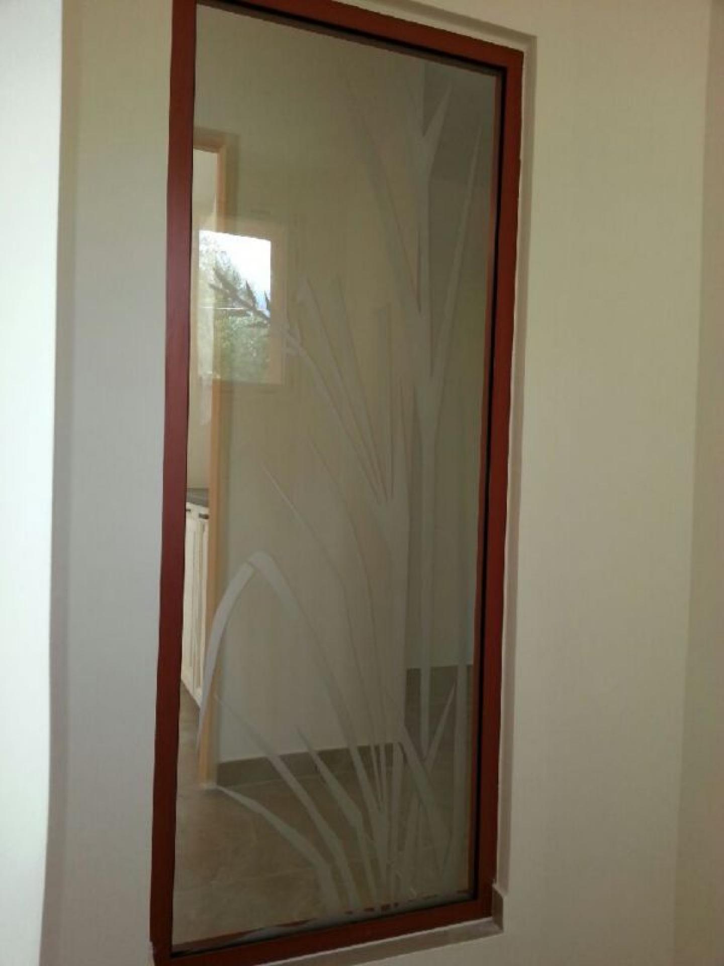 à l'aide d'un plotter de découpe M.A.P à conçu ce pochoir et sablé le vitrage pour donner cet effet de motif pour une séparation de piéces sur Eguilles .