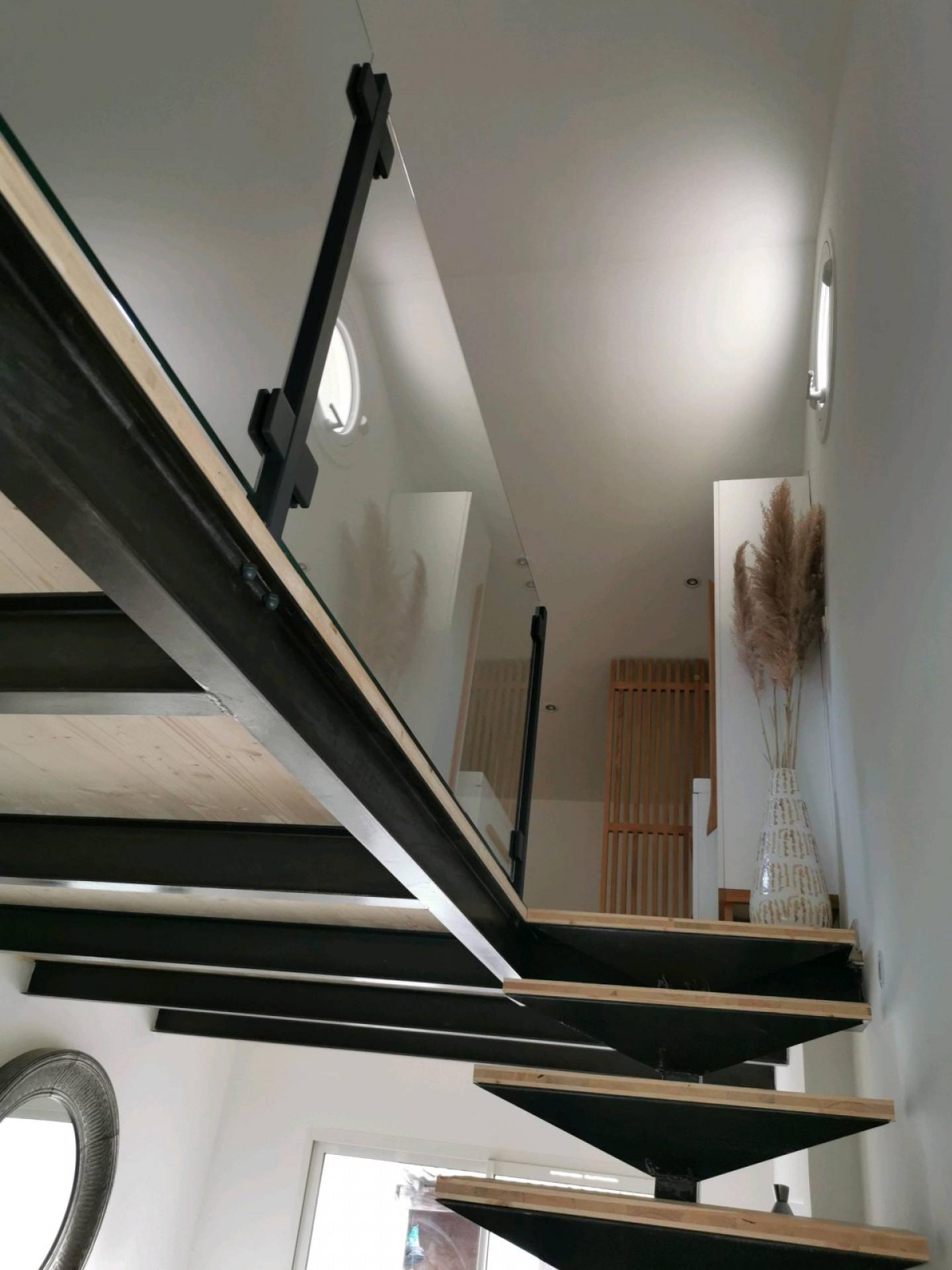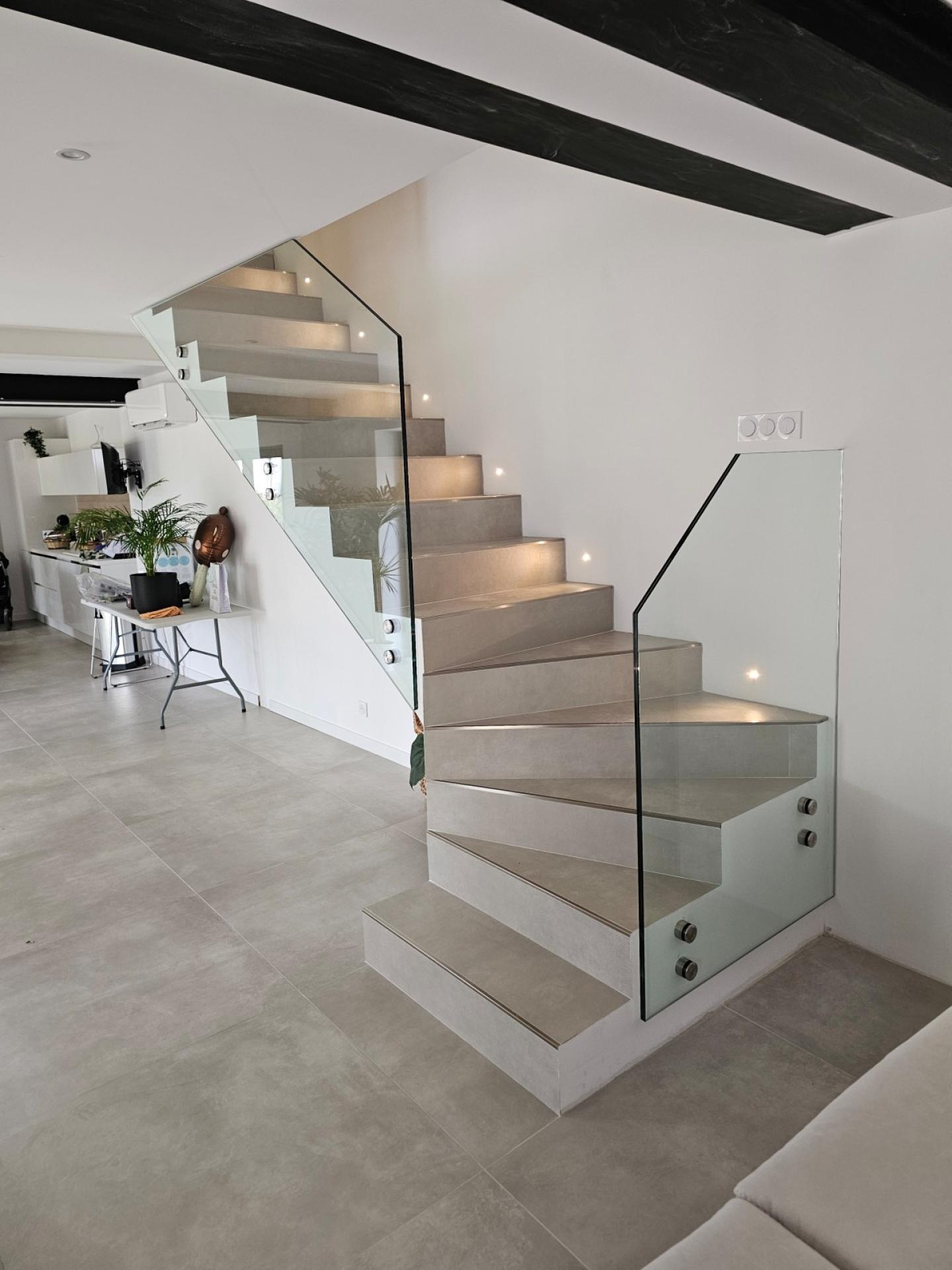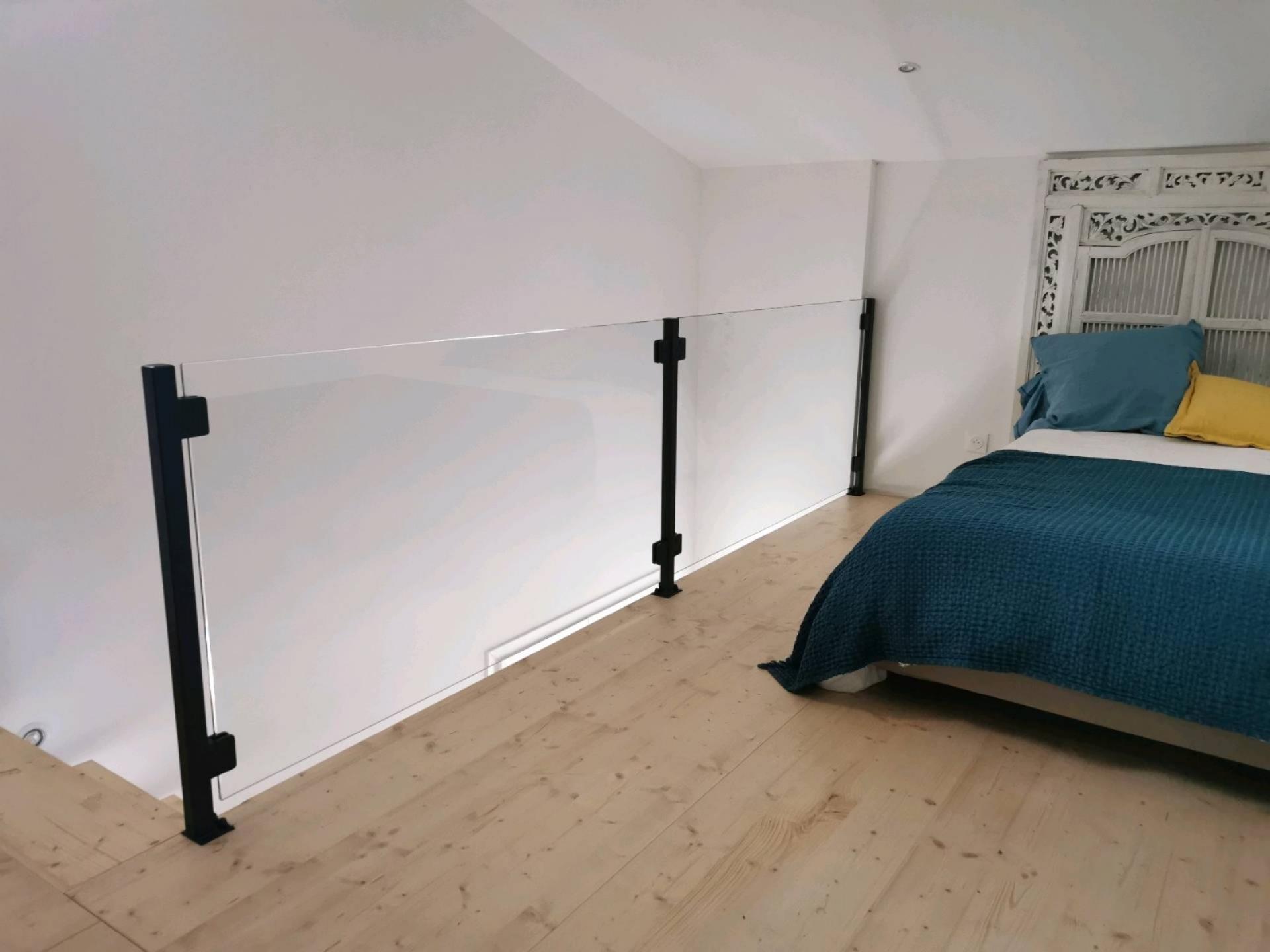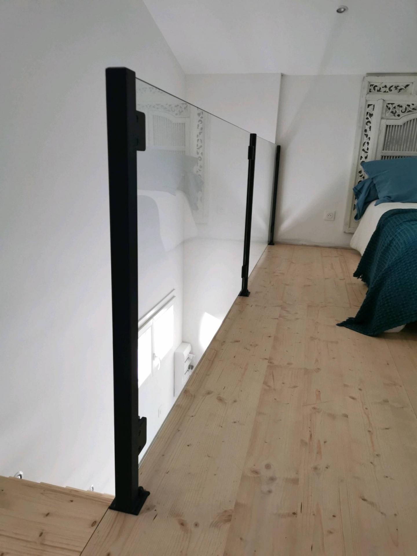 La Miroiterie d'Art Provençale à Salon de Provence a fabriqué et réalisé ce magnifique garde-corps en verre feuilleté et poteaux acier sur mezzanine pour un duplex sur Mimet.