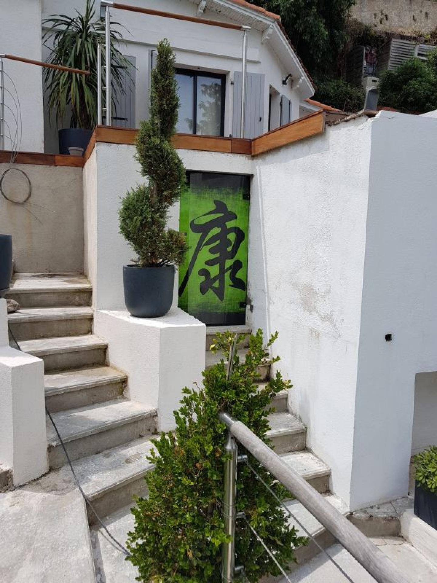 Notre société a réalisé l'impression numérique sur vitrage trempé en 8 mn d'une porte pour un local technique de piscine à Istres.