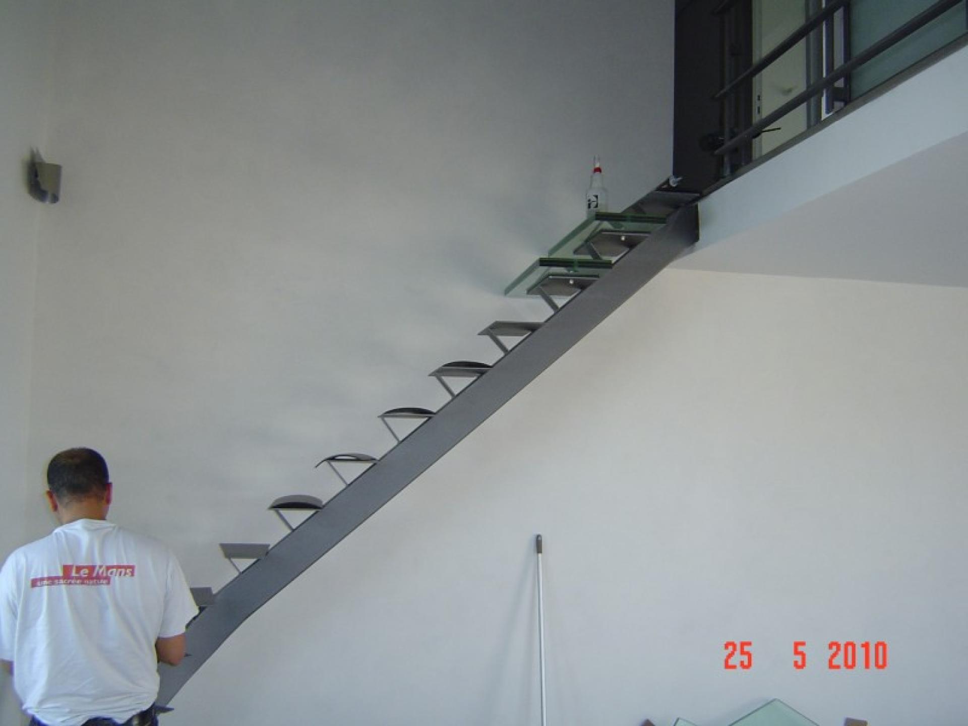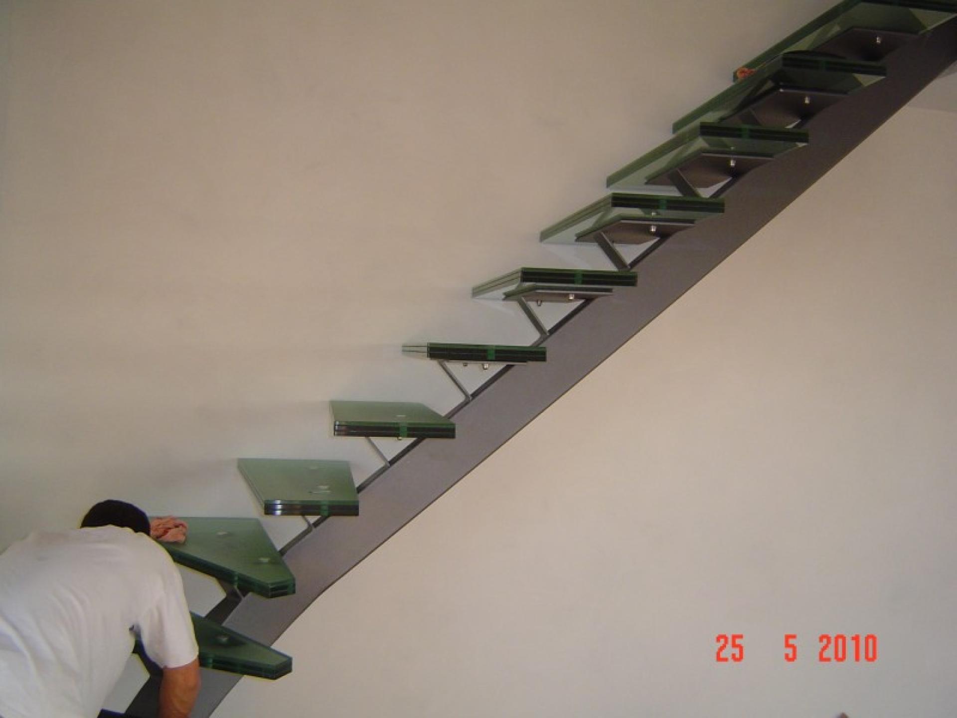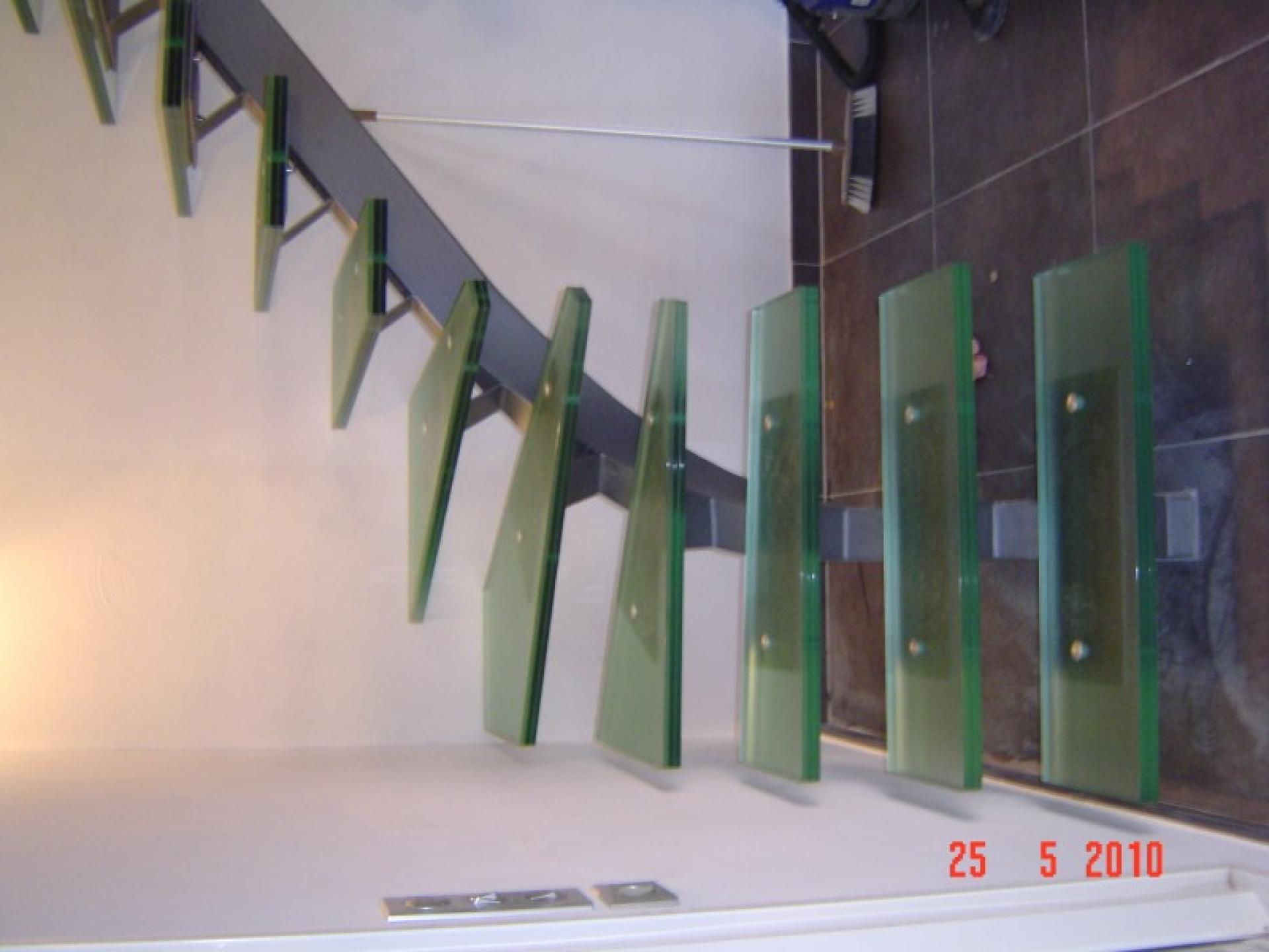 L'escalier est sur mesure, avec des marches en verre de 30 mm d'épaisseur, tri-feuilleté, joints polis.