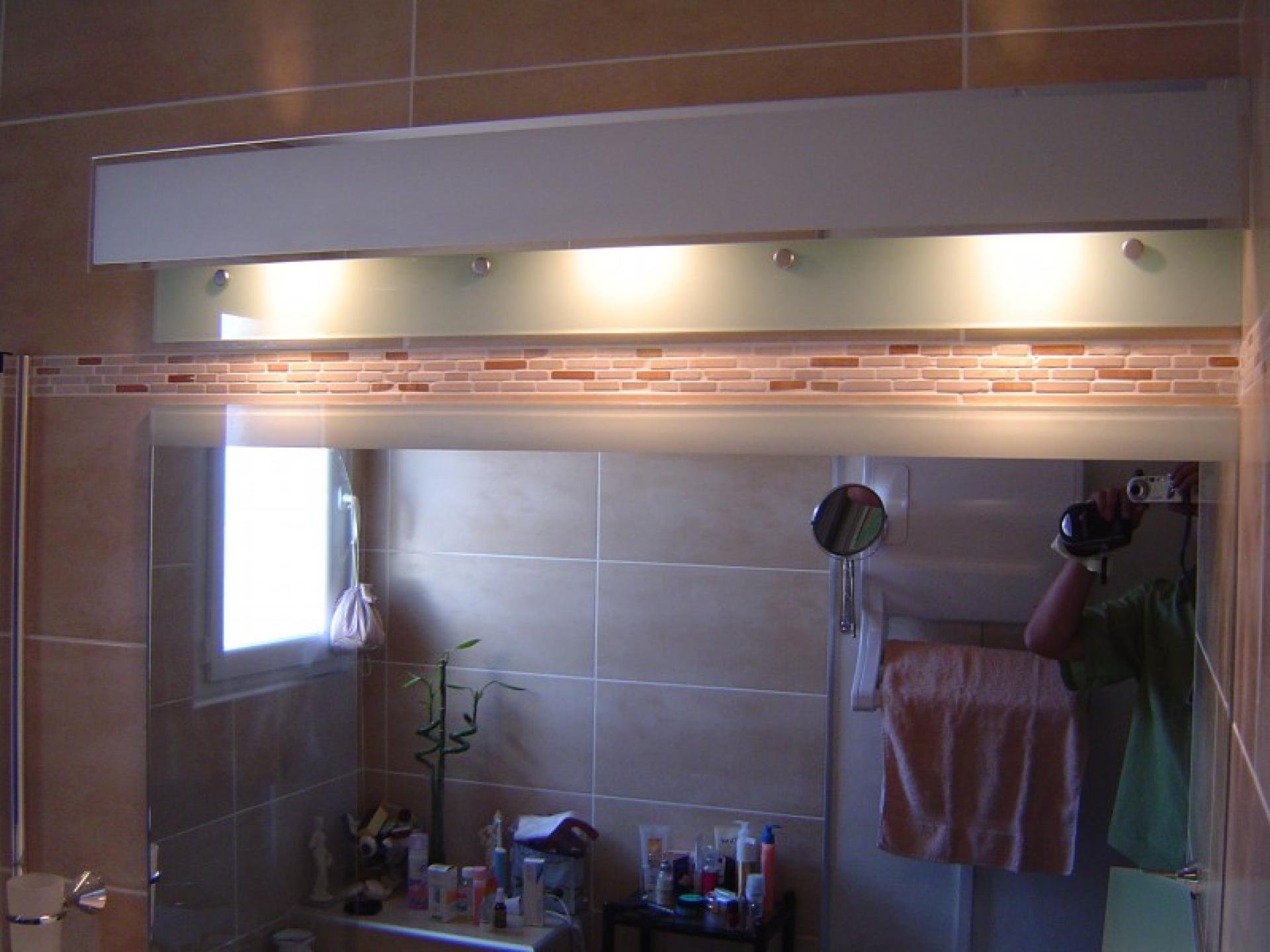 La Miroiterie à Salon de Provence à conçu pour une salle de bain un bandeau en verre dépoli avec collage U.V pour un eclairage discret .