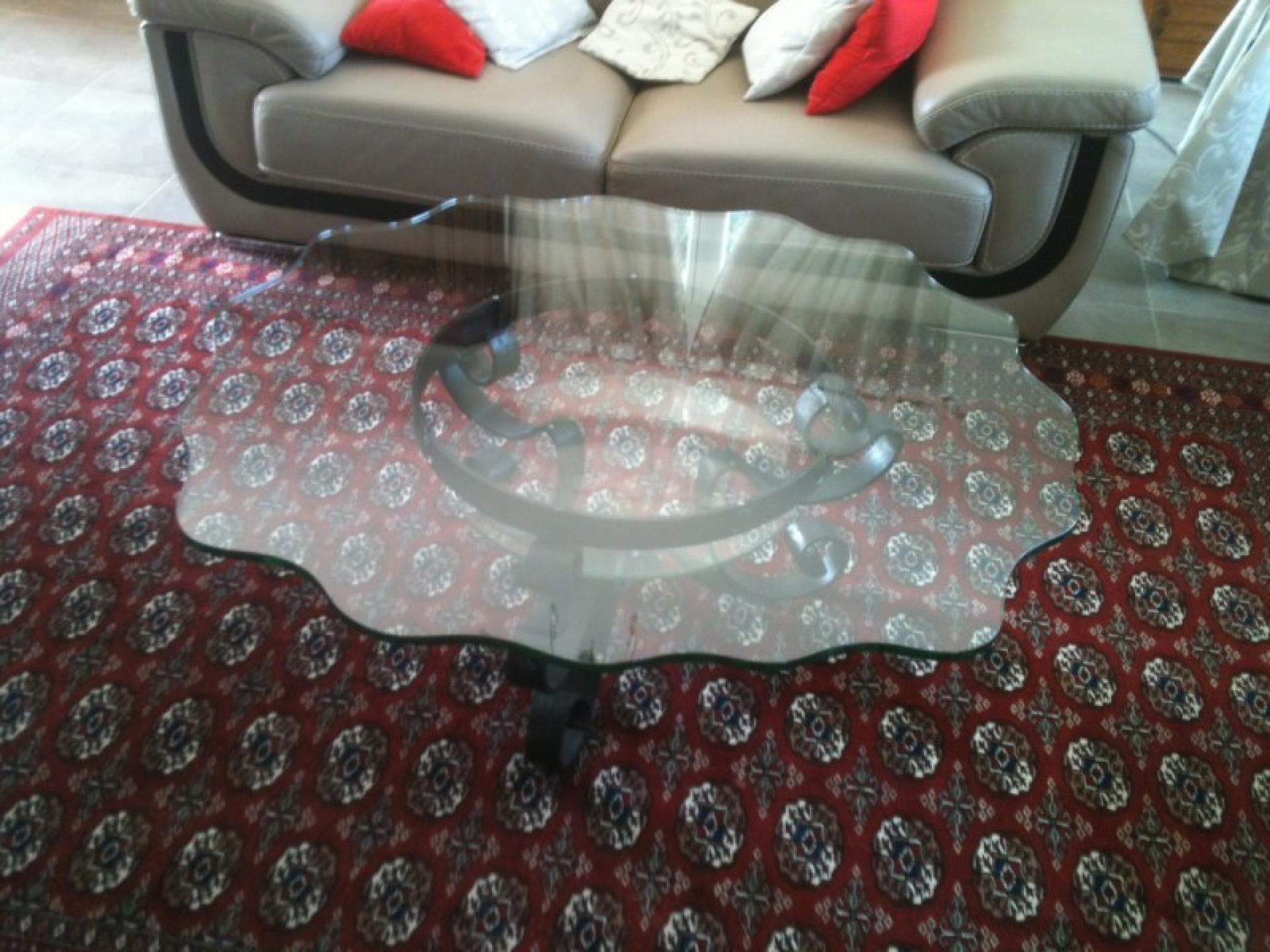 La Miroiterie à Salon de Provence a réalisée cette table sur mesure en verre 12 mm joint poli en forme de pétale.